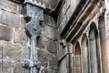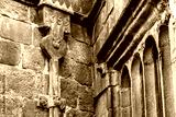 Detailed view of medieval leaded guttering seen on the outside of a medieval building. The date made can be seen on the gutter and royal crests further down.