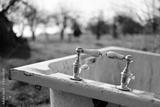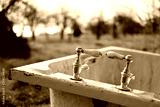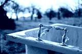 Old, abandoned ceramic bath and chrome water taps as seen in a field, with the bath being used as a water trough.