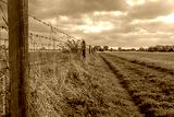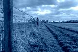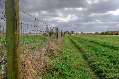 Distant view of a grassed public footpath seen adjacent to a barded-wire farm fence which has dairy cattle. The path extends to the distant, to a large nature reserve.