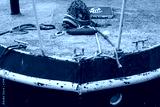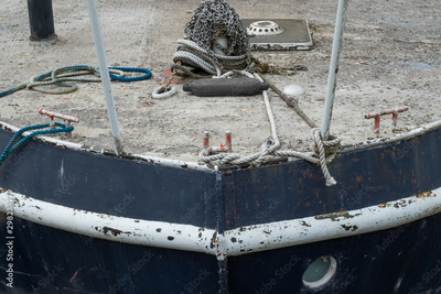 Front, detailed view of a weathered fishing trawler showing its rough deck texture. Also in view is the ships anchor chain and single porthole in the hull.