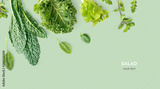 Creative layout made of kale, salad leaves, spinach, ruccola on green background. Flat lay. Food concept. Macro concept.
