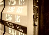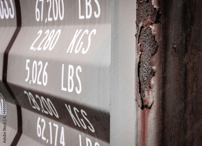 Isolated shipping container showing weight measurements printed on one of the doors and in view is weather and rust of the metal of the container.