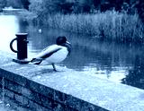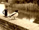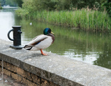 dult mallard duck seen standing on a quay area within a Cambridgeshire town.