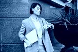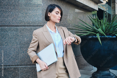 Young confident businesswoman in beige suit with laptop watching time on wristwatch outdoor