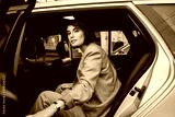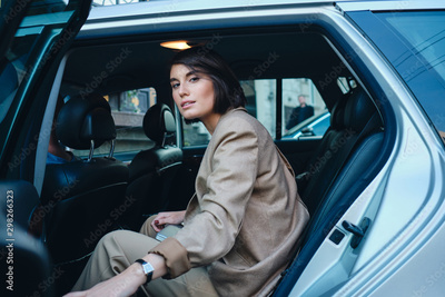 Young beautiful businesswoman sitting in car confidently looking in camera