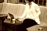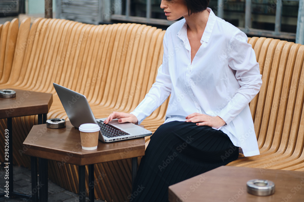 Close up young businesswoman with coffee to go thoughtfully working on laptop in cafe on street