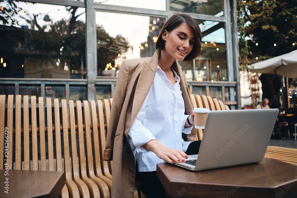Young attractive businesswoman happily working on laptop during coffee break in cafe on street