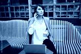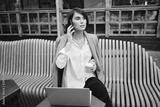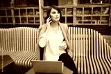 Young confident businesswoman with laptop talking on cellphone during coffee break in cafe on street