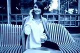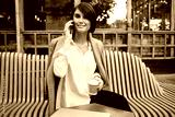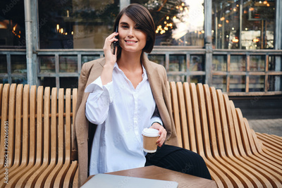 Young pretty businesswoman with laptop happily talking on cellphone during coffee break in cafe on street