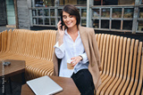 Young businesswoman with laptop joyfully talking on cellphone during coffee break in cafe on street
