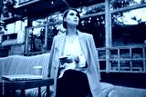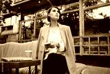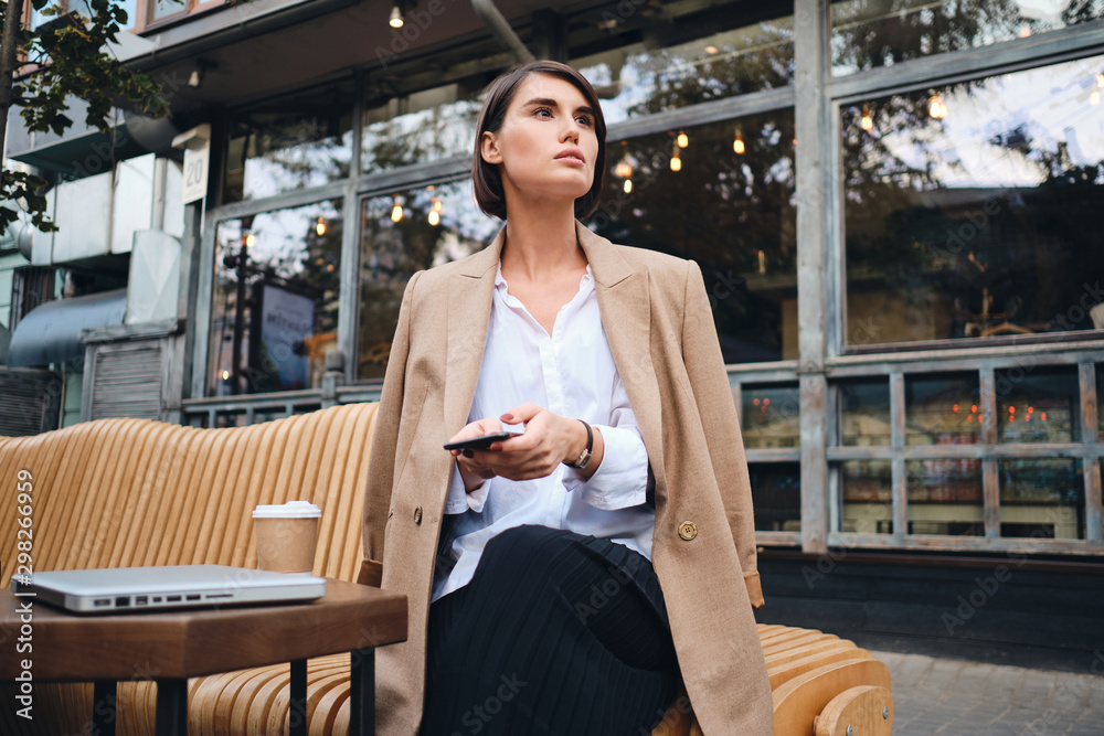 Young gorgeous businesswoman with cellphone intently looking away during coffee break in cafe on street