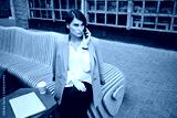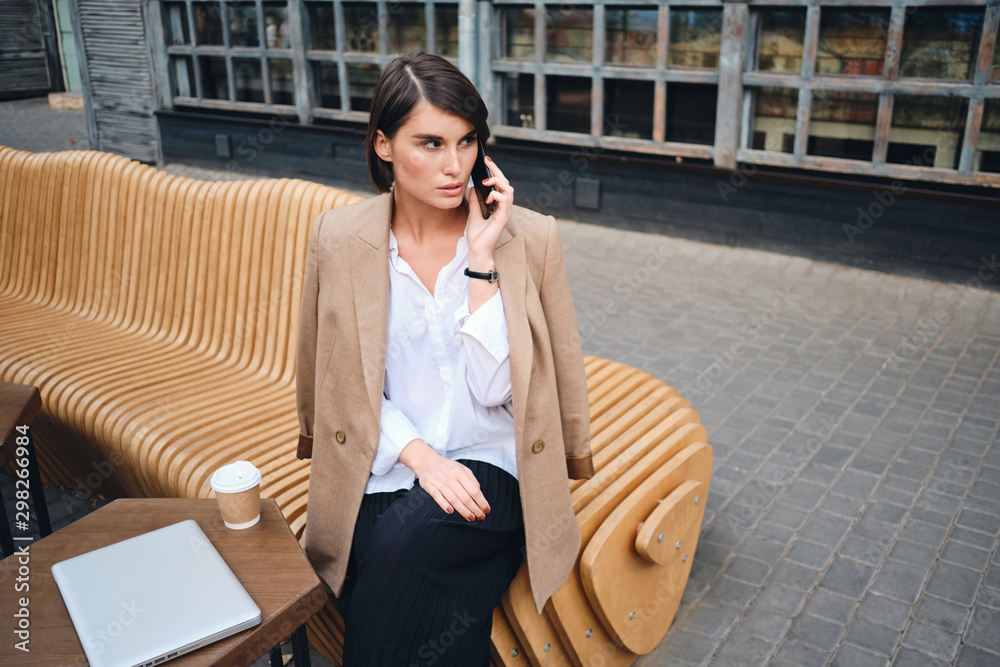 Young serious businesswoman talking on cellphone confidently looking away during coffee break in cafe on street