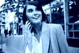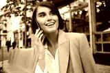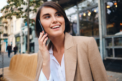 Portrait of cheerful businesswoman happily talking on cellphone in cafe on street