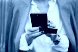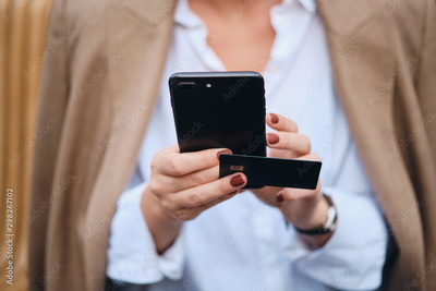 Close up stylish businesswoman with credit card using cellphone outdoor