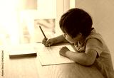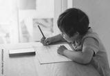 Portrait of preschool kid using mobile phone for his homework, Selective focus of Child doing homework by using cell phone searching information on internet, Home schooling education concept
