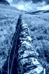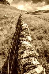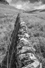 Detailed view of an ancient stone wall seen in the heart of the Yorkshire dales. The mountainous region can be seen in the background. Famous for its farming, picturesque landscape and hiking alike.