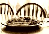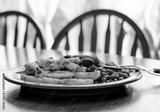 Freshly prepared plate of potato chips, fish fingers and garden peas on a plate, on a garden table.