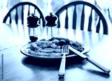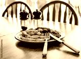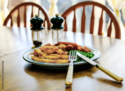 Freshly prepared plate of potato chips, fish fingers and garden peas on a plate, on a garden table.