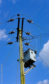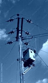 Detailed view of a high power electrical cabling system seen atop a utility pole.