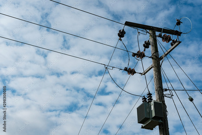 Detailed view of a high power electrical cabling system seen atop a utility pole.
