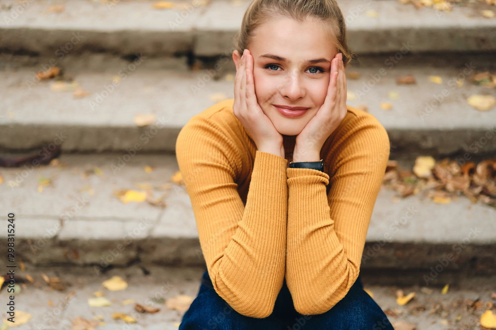 Portrait of cute smiling girl dreamily looking in camera sitting on stairs in city park