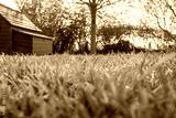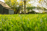 Ground level, shallow focus view of a well maintained private lawn shown with an out of focus, timber built chicken house in the background together with a small tree, taken in summer.