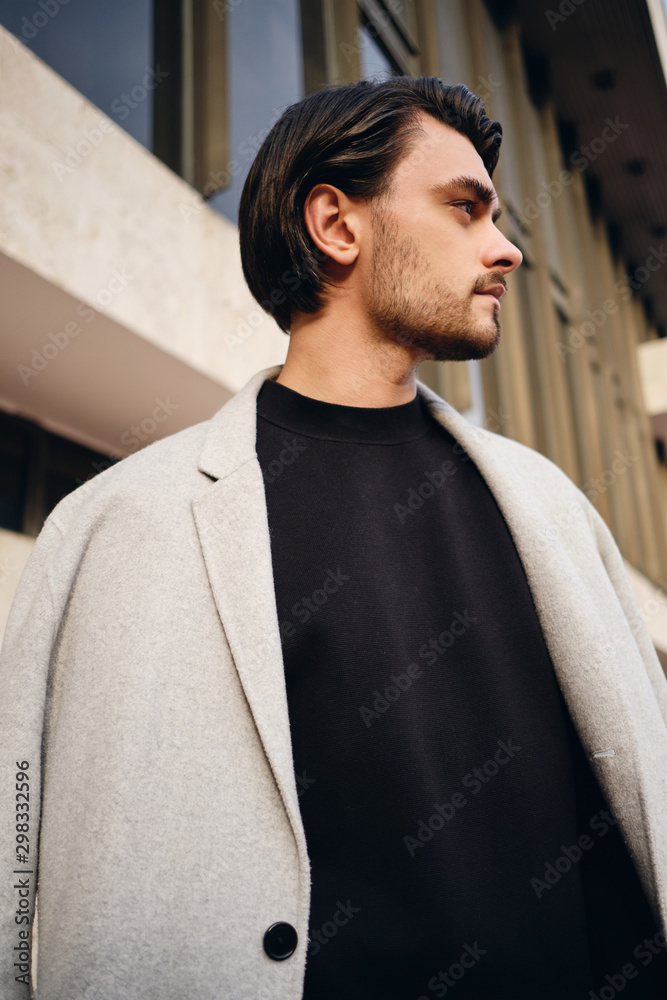 Side view of serious stylish man in coat thoughtfully looking away outdoor