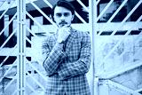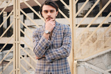 Young handsome man in checkered jacket wistfully looking in camera on street