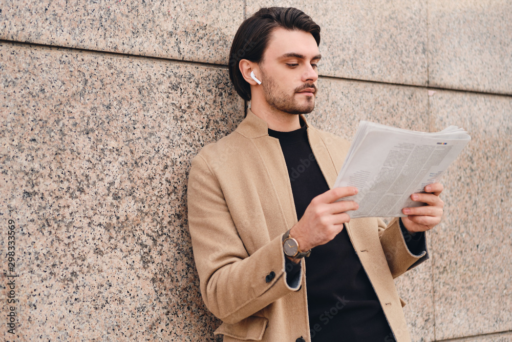 Young attractive man in beige coat confidently reading newspaper outdoor