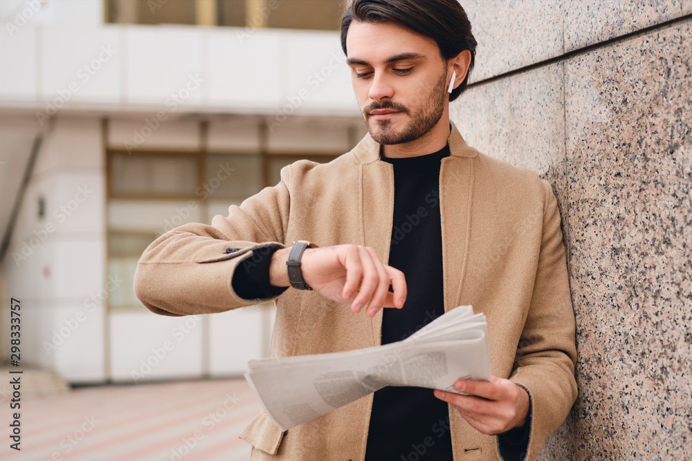 Young handsome man in beige coat with newspaper dreamily watching time on wristwatch outdoor