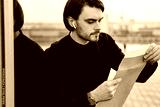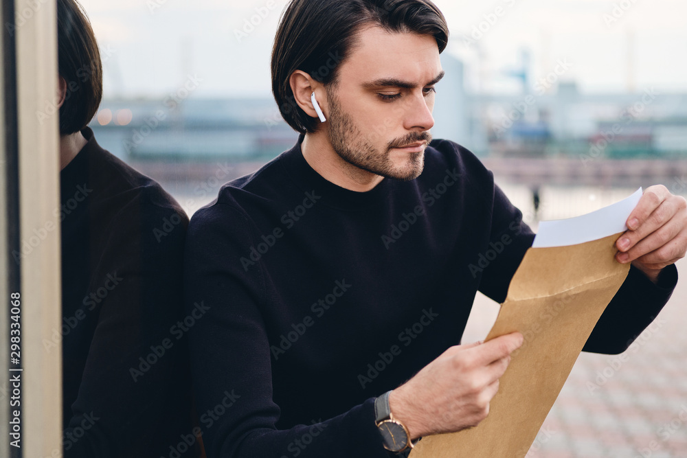 Portrait of handsome serious man confidently opening envelope with response outdoor