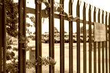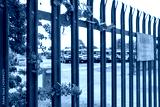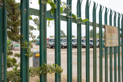 Shallow focus of HGV transport and dumper trucks seen parked in a secure location near a gravel works. The in focus nearby metal fence is spiked for security reasons.