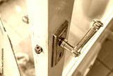 Shallow focus of a brass door handle, seen on a partially opened wooden framed back door. An out of focus trainer and door matt can be seen in the background.