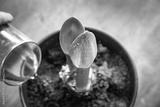 Shallow focus of a newly sprouted interior plant seen being watered by an out of focus drinking glass. Water droplets and dew can be seen at the top of the buds, in a tight focus.
