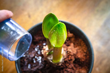 Shallow focus of a newly sprouted interior plant seen being watered by an out of focus drinking glass. Water droplets and dew can be seen at the top of the buds, in a tight focus.