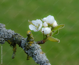 Delicate apple blossom seen on a small branch in a commercial cider orchard in spring.