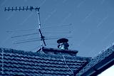 Old style TV antenna seen attached to a chimney of an old brickwork cottage with the aerial cable seen running over the rooftop.