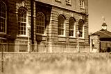 Detailed view of the outside of one of the famous University of Cambridge buildings taken an an interesting, low angle from a nearby lawn in early summer.