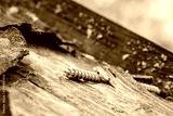 Shallow focus of an isolated wood screw seen drilled into a wooden shed roof. Part of the asphalt weather proofing has decayed showing the timber roof lining.