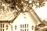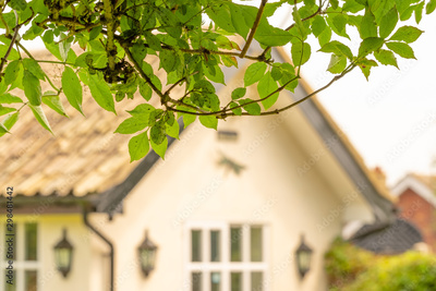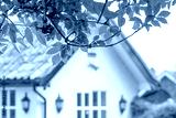 Shallow focus of weeping tree branches and leaves seen partially framing part of a large ground floor house. Part of a large window and security lanterns are seen