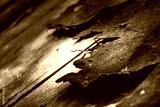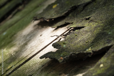 Close-up, shallow focus of galvanised screws and nails see securing asphalt liner on a shed roof. Part of the lining has decayed and dried out, exposing the timber roof itself.