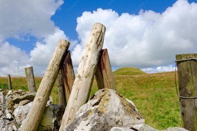 Shallow focus of an improvised climbing step seen over a very old, stone wall in the heart of the Yorkshire Dales. A large hill can be seen in the background.