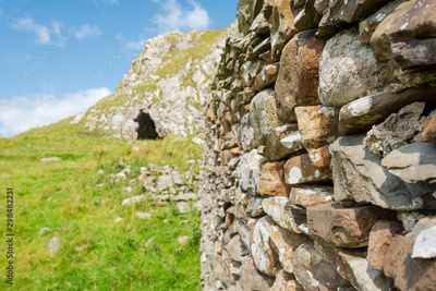 Shallow focus of an ancient stone wall seen in the heart of the Yorkshire Dales. A distant, prehistoric cave opening can be seen in a nearby hill.