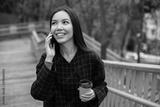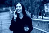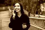 Young cheerful woman in coat with coffee to go happily talking on cellphone in park