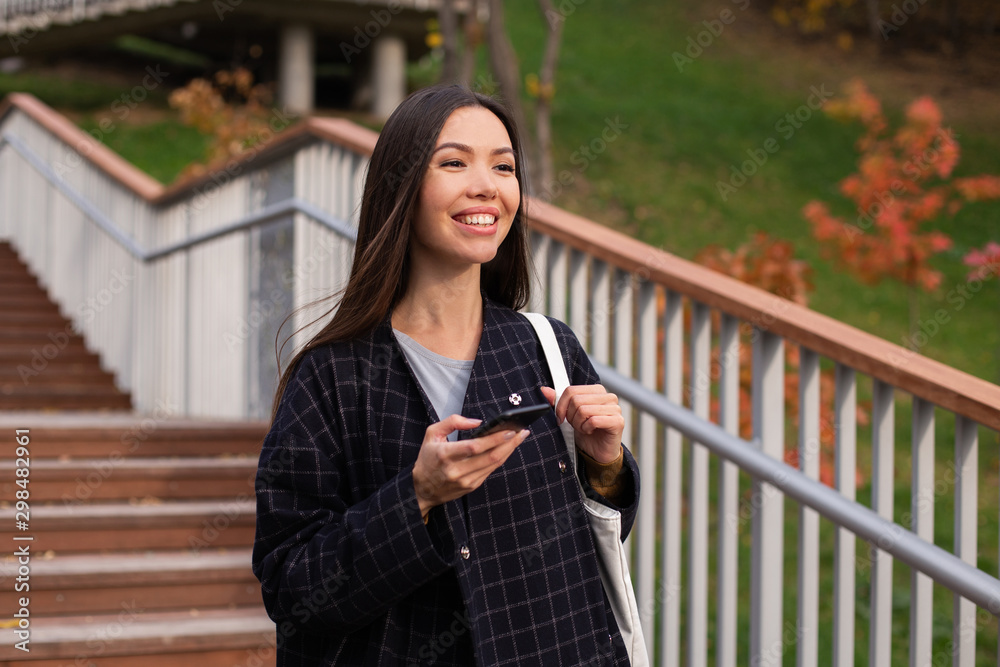 Young cheerful casual woman in coat with cellphone joyfully walking in park