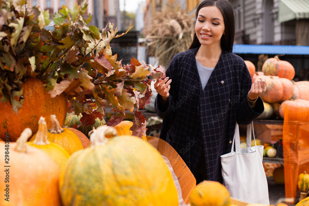 Young attractive smiling casual woman at farm shop happily looking for pumpkin for Halloween day