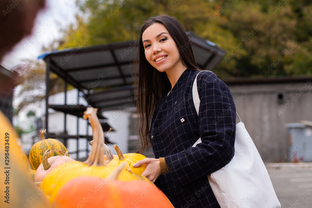 Young pretty casual woman happily looking in camera buying pumpkin for Halloween day at autumn farm shop