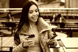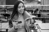 Young pretty woman in down jacket with coffee to go joyfully listening music in earphones on cellphone outdoor
