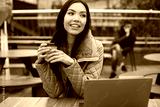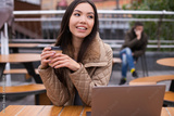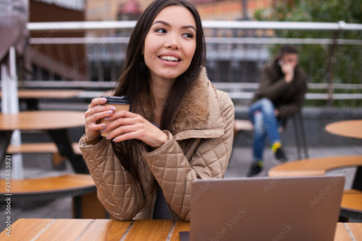 Young beautiful casual woman in down jacket with laptop happily drinking coffee in cafe on street