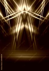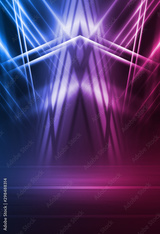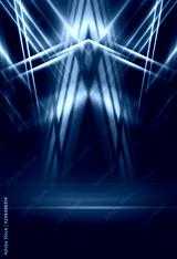 Empty background scene. Dark street reflection on wet asphalt. Rays of neon light in the dark, neon shapes, smoke. Background of an empty stage show. Abstract dark background.